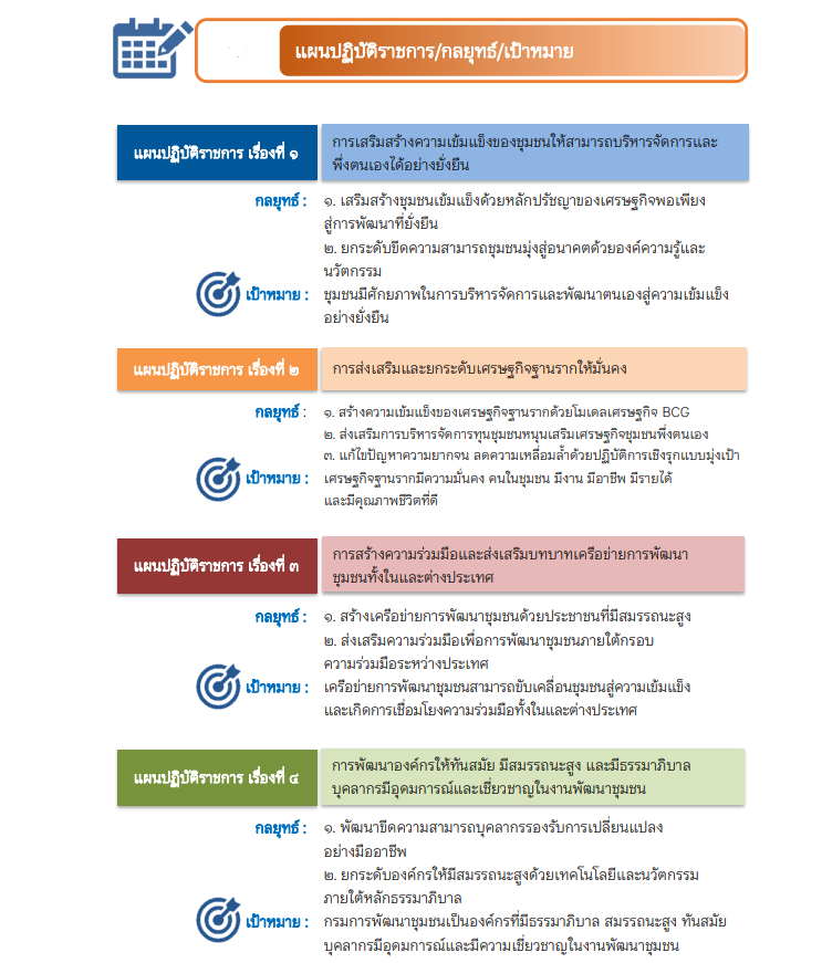 แผนปฏิบัติราชการระยะ 5 ปี (พ.ศ. 2566 – 2570) ของกรมการพัฒนาชุมชน ได้กำหนดเป้าหมาย ตัวชี้วัด แนวทางการพัฒนา พร้อมทั้งมาตรการและแนวทางปฏิบัติในการขับเคลื่อนงานพัฒนาชุมชนภายใต้แผนปฏิบัติราชการ 4 เรื่อง ประกอบด้วย